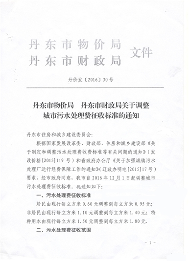 • 丹東市物價局 丹東市財政局關于調整城市污水處理費征收標準的通知2017-06-15
