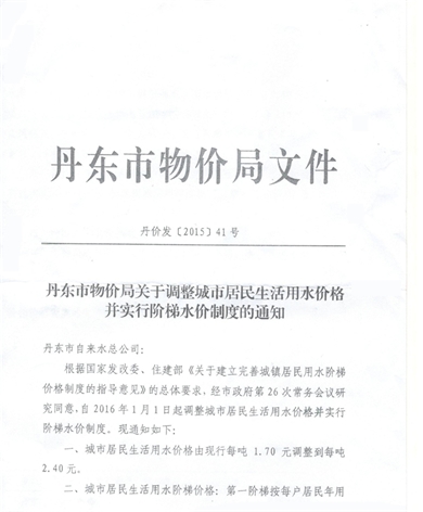 • 丹東市物價局關于調整城市居民生活用水價格并實行階梯水價制度的通知2017-06-15